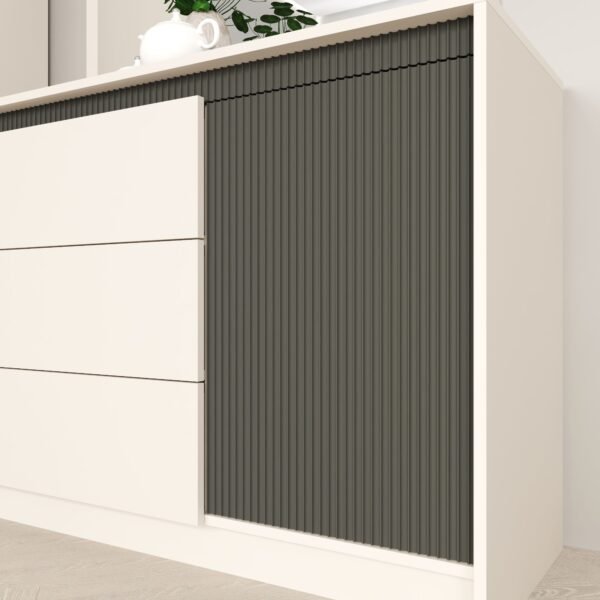 Меблі Монако характеризуються лаконічним дизайном із текстурними контрастами, строгими геометричними формами, міцною основою та гладкими фасадами без традиційних ручок, які підкреслюють мінімалістичний стиль колекції.