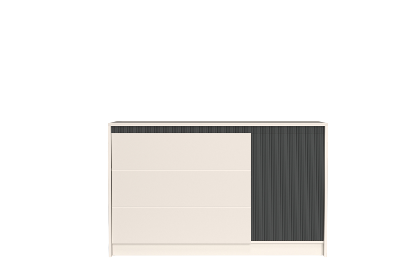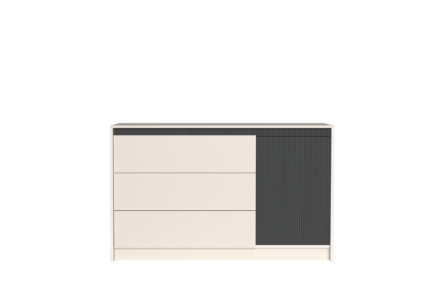 Комод KOM1D3S МОНАКО Гербор однодверний із трьома шухлядами – елемент модульної системи Monaco від фабрики Gerbor-холдiнг. Виготовляється з ламінованої ДСП у двох колірних рішеннях: кашемір та кашемір / елегантний сірий софт тач. Дно шухляд та задня стінка виконані з ДВП 3 мм сірого кольору. Всередині закритого відділення розташована одна полиця. Двері та шухляди відкриваються за допомогою системи Push to Magnet HETTICH легким натисканням на фасад. Використовуються напрямні повного висування HAFELE та навісні петлі HETTICH.
