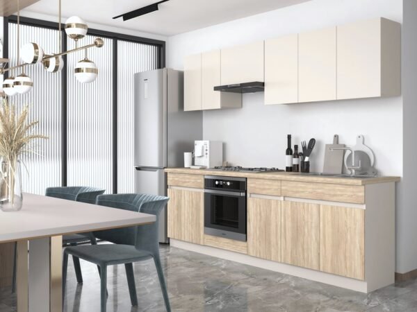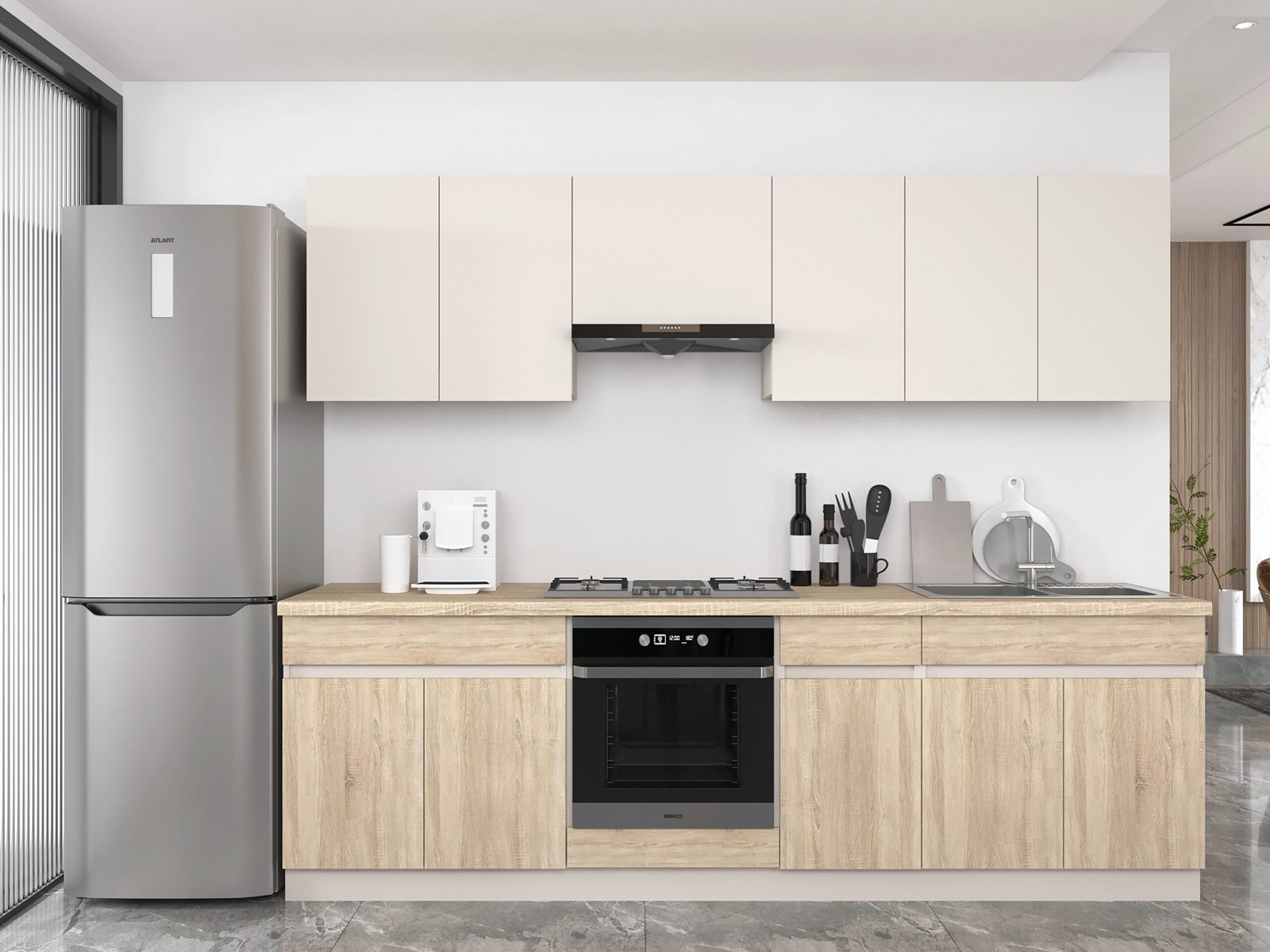 Кухня ЮЛІЯ Гербор 260 – меблевий комплект для кухні від фабрики Gerbor-холдiнг. Виготовляється з ламінованої ДСП товщиною 16 мм у кольорі кашемір / дуб сонома. Дно шухляд та задня стінка виконані з ДВП 3 мм сірого кольору. Кромка: бумага просочена термореактивними полімерами. Кухня комплектується стільницями 140х60 см та 120х60 см висотою 2,8 см в кольорі дуб сонома. Використовуються навісні петлі HETTICH, роликові напрямні GAMET. Тумби встановлені на ніжках 10 см, що регулюються, закритих цоколем.